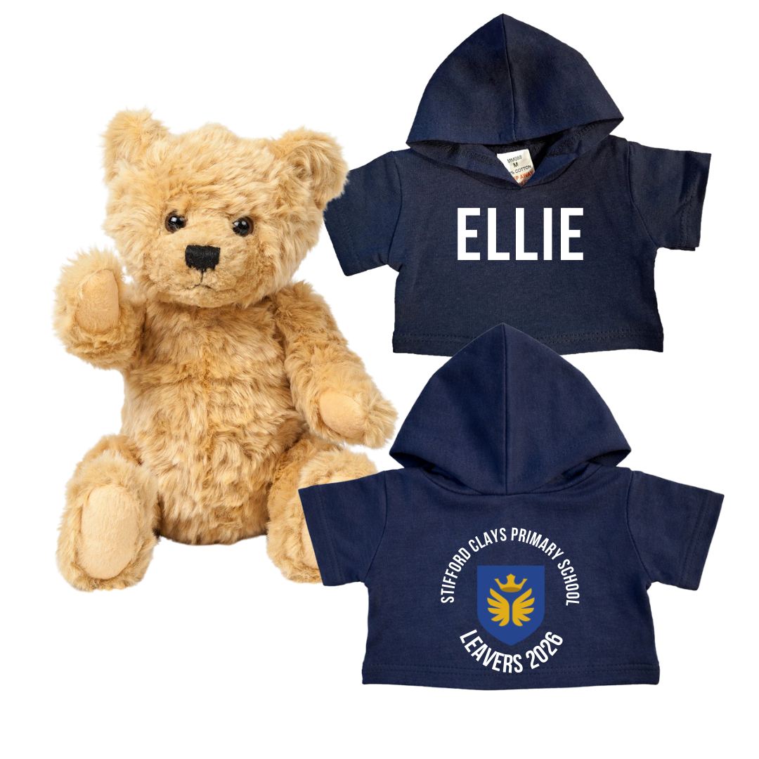 A cuddly and memorable keepsake to celebrate their leavers year. This soft teddy bear comes dressed in a mini hoodie, personalised with the child’s name on the front and the school crest design on the back. A perfect memento to remember their primary school journey and a lovely keepsake to treasure for years to come.