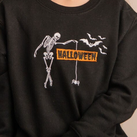 Embrace the eerie elegance of Halloween with this striking embroidered Sweater or Hoodie option. The centerpiece is a higly detailed skeleton, artfully crafted with precision, holding a spider that dangles ominously from his bony fingers. Featuring the boldly displayed word "HALLOWEEN" further decorated with fluttering bats adding a touch of haunting charm.