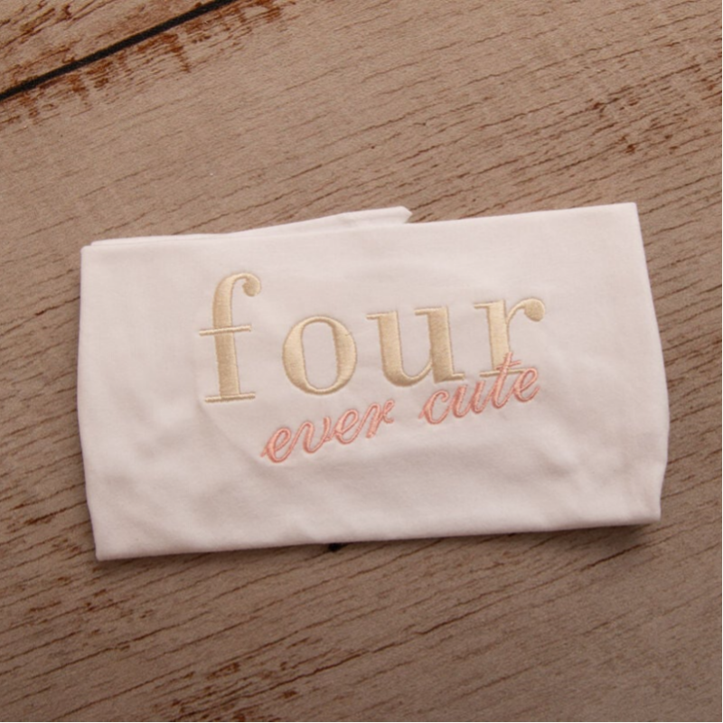 Celebrate your little one's 4th birthday in style with our adorable embroidered T Shirt featuring our exclusive "Four Ever Cute" design. The large, beautifully embroidered word "four" takes center stage, while the word "cute" playfully overlaps at an angle below, creating a charming and unique look. Customise the design with different thread colors to match your child’s personality, making this piece as perfectly beautiful as your little one