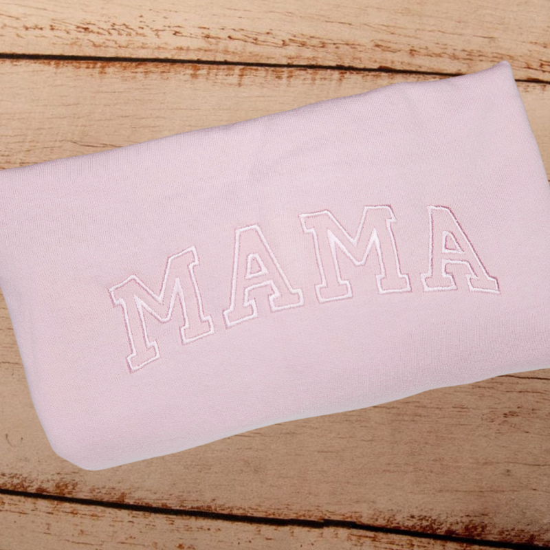 Celebrate motherhood with our stylish "Mama" embroidered sweater or hoodie. Featuring "Mama" in a college font, slightly curved across the front, this design is both classic and contemporary. Our monochrome colour match thread offers a sleek look, but you can also choose from a wide range of thread colours to match your personal style or mood.